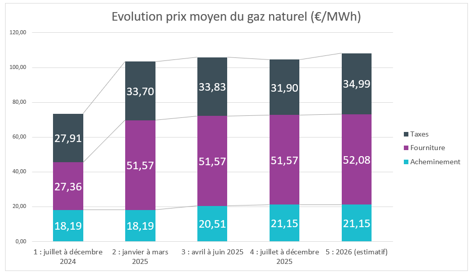 Les prix TTC du gaz naturel en 2026 par rapport aux précédents marchés 2025 du Groupement (à consommation constante et au regard des tarifs d’acheminement et taxes en vigueur) augmentent de 3%.